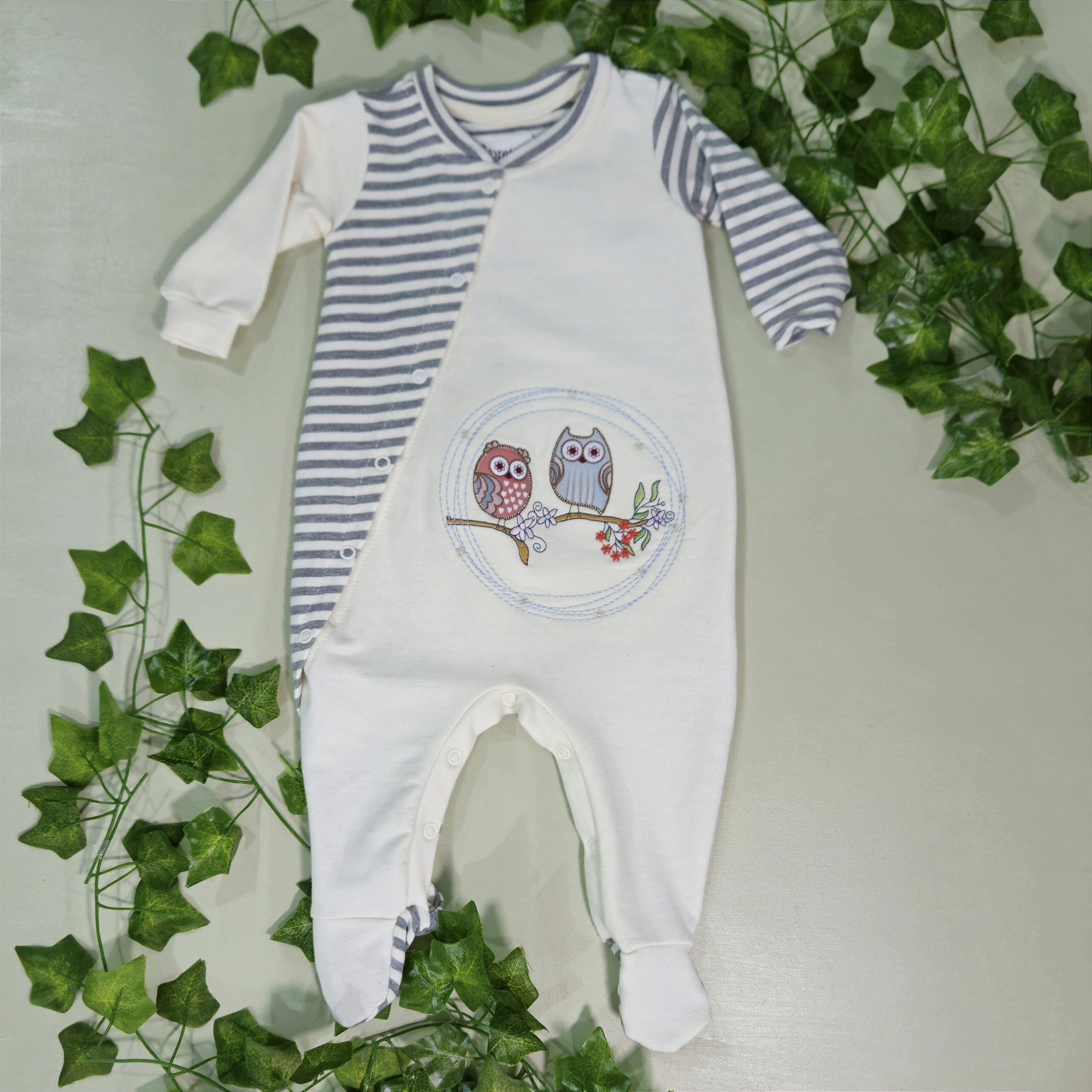 Macacão com pé confeccionado em malha 49% algodão 49% viscose e 2% elastano, malha encorpada e bem quentinha, perfeito para os dias mais frios. Tem um aplique de sublimação de corujinhas, cor neutra. Esse modelo é unissex. Tomar cuidado com a plaquinha com o logo da marca, pois é de material sintético e pode derreter se passar com ferro ou secadora.