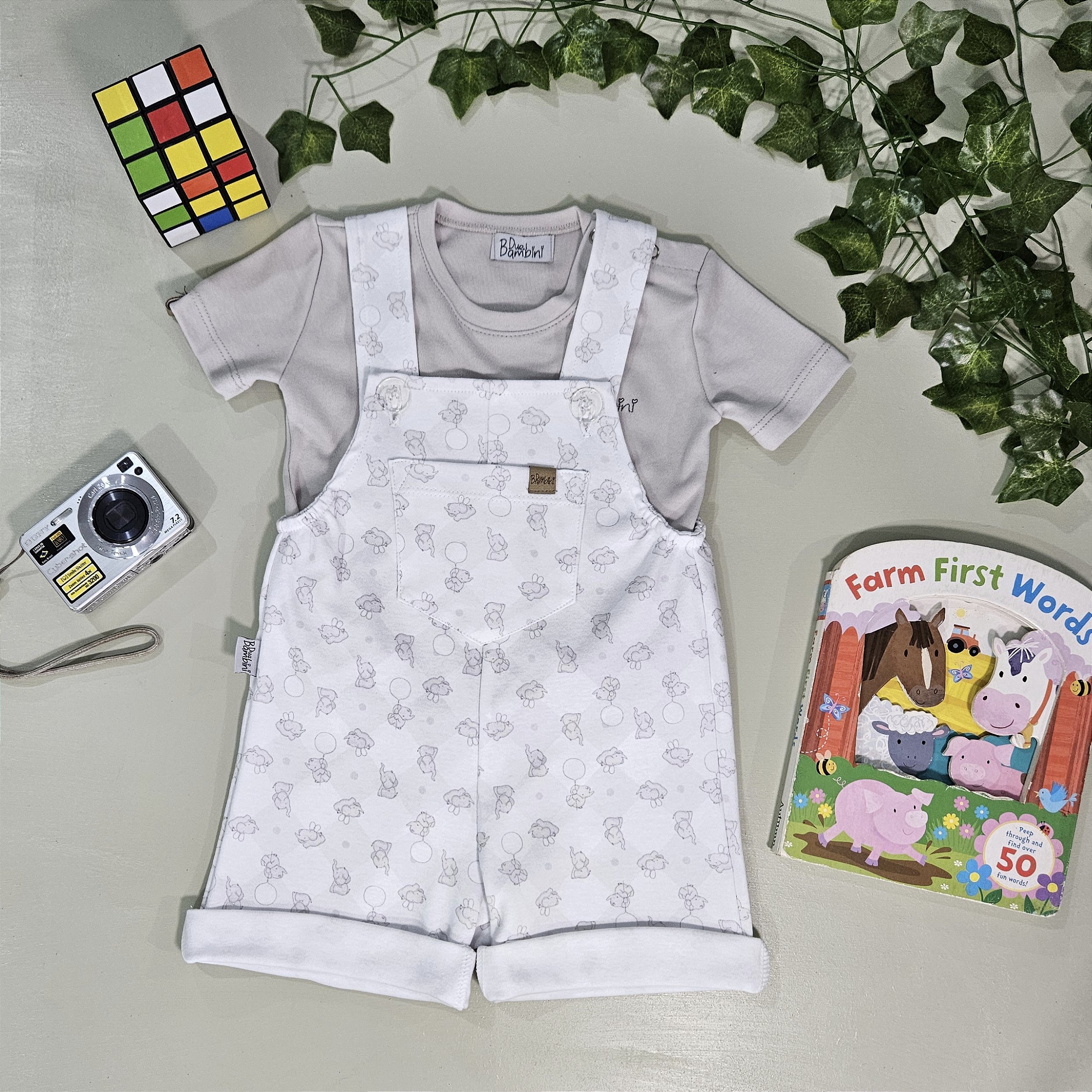 Salopete confeccionada em malha suedini 100% algodão com estampa de elefante, alças com botões de massa, bolso frontal com plaquinha de sintético, cuidado ao passar com ferro. Camiseta confeccionado em malha cinza mescla 100% algodão, tem bordado com nome da marca e botões nos ombros para facilitar a vestimenta, tem plaquinha de sintético com logo da marca, evitar ferro.