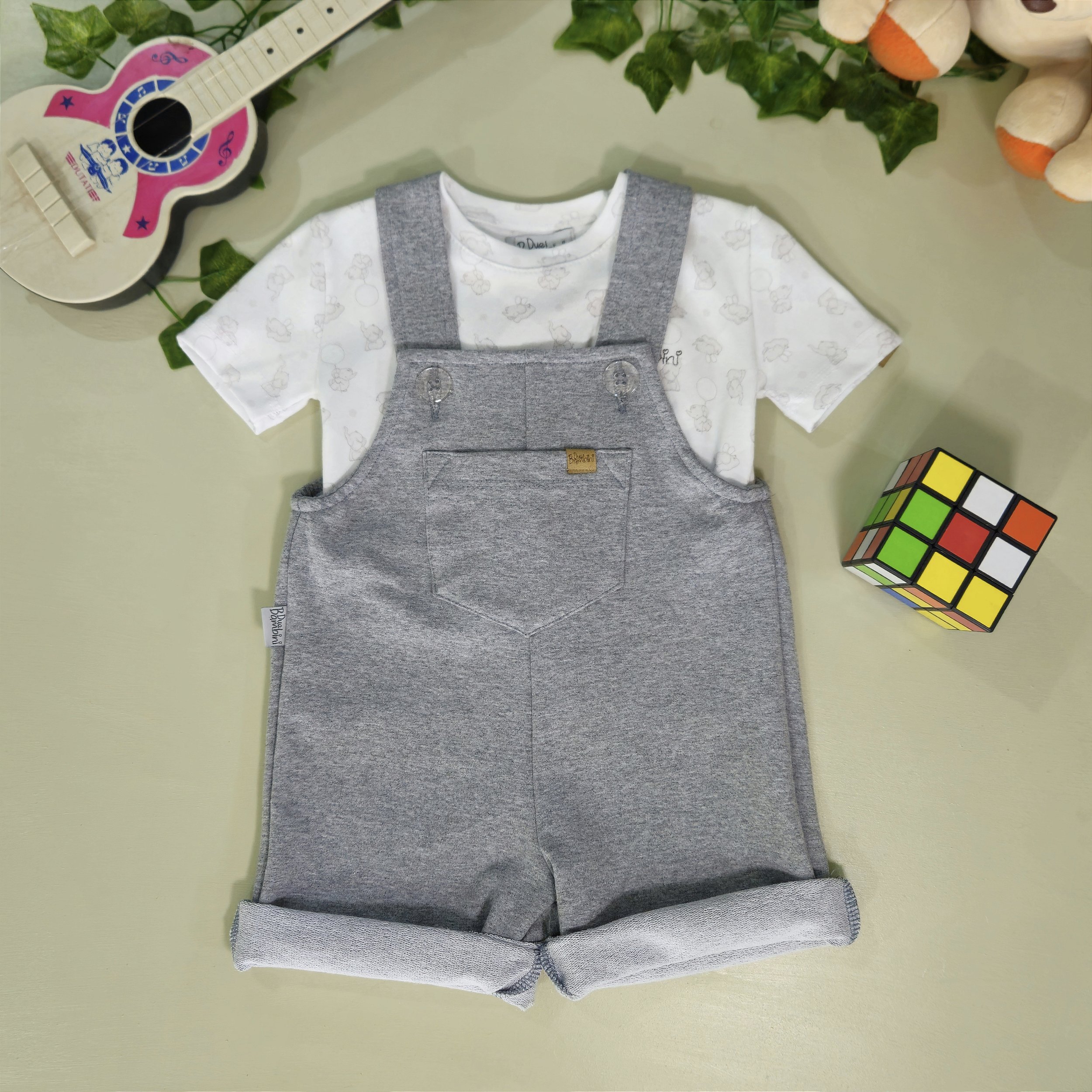 Salopete confeccionada em moletinho encorpado 85%algodão 10%poliéster 5%elastano, na cor cinza mescla, alças com botões de massa, bolso frontal com plaquinha de sintético, cuidado ao passar com ferro. Camiseta confeccionado em malha estampada de elefante 100% algodão, tem bordado com nome da marca e botões nos ombros para facilitar a vestimenta, tem plaquinha de sintético com logo da marca, evitar ferro.