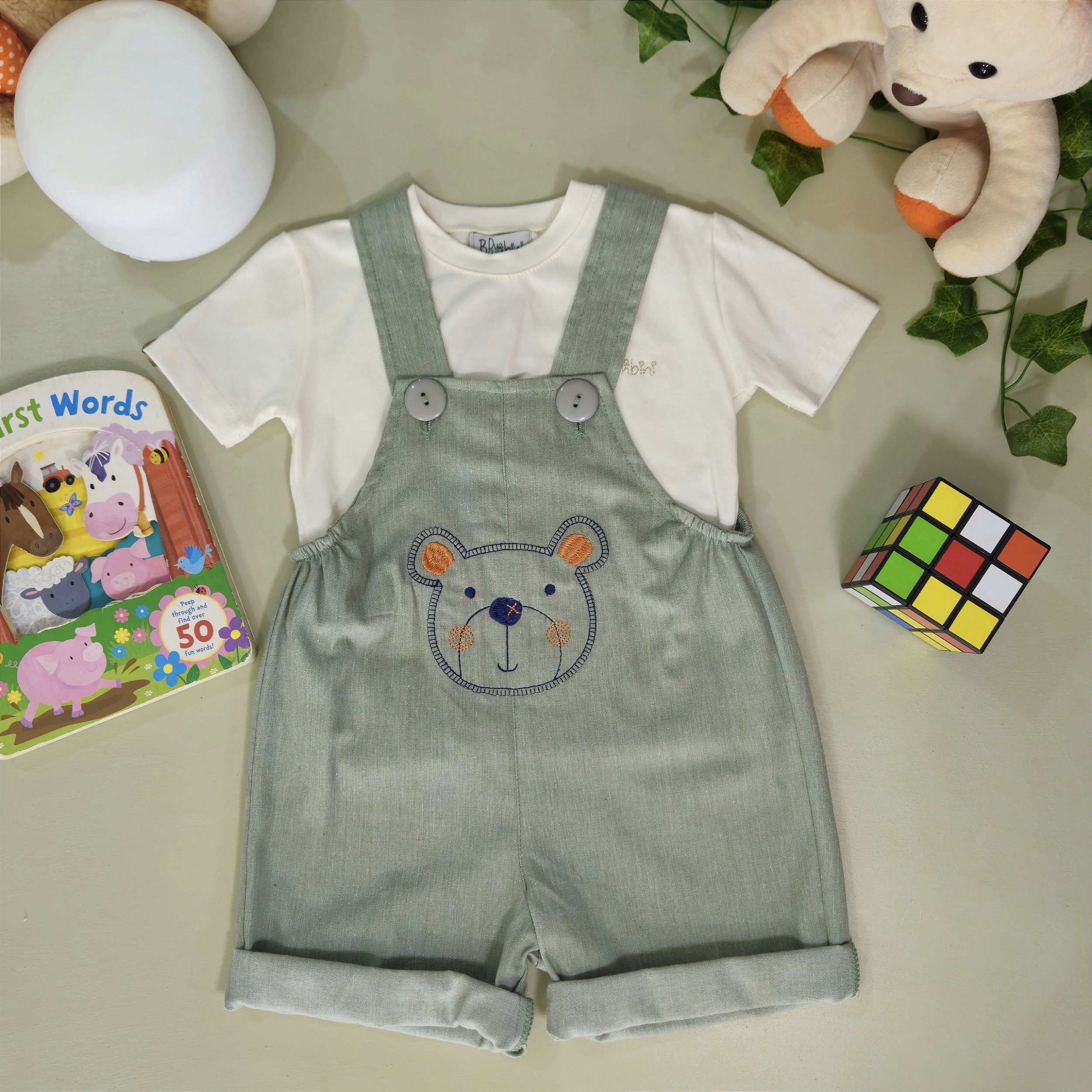 Salopete azul confeccionada em chambre 62%algodão 38%poliéster, com bordado de urso, botões de massa e bolsos traseiros. A camiseta é em malha 96% algodão 4% elastano, tem bordado com o logo da marca e botões no ombro para facilitar a vestimenta no bebe. Tem plaquinha de sintético, evitar ferro e não secar na secadora.